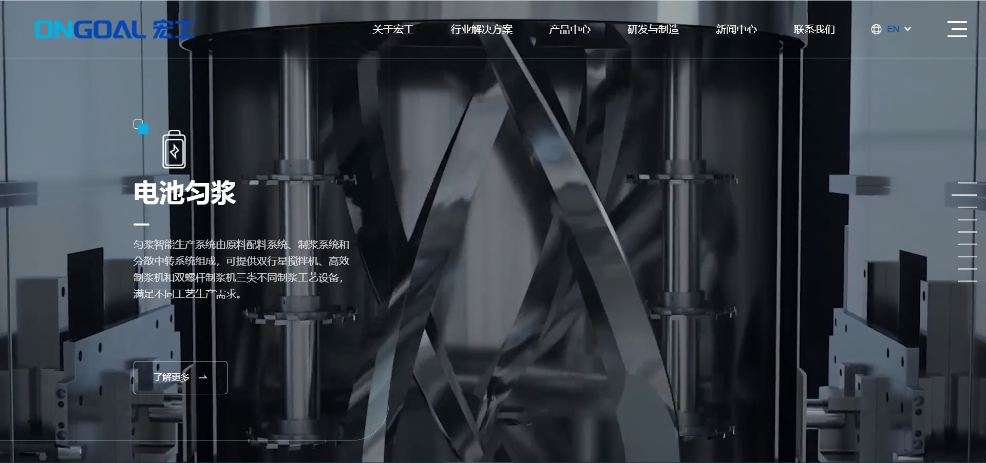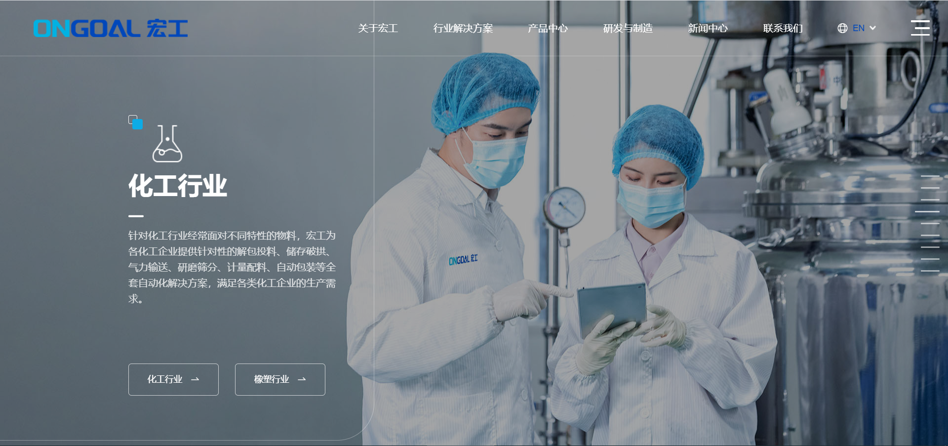 新版網站首頁啟用了全新的地圖導覽,從解包投料到成品包裝的一系列物料處理系統,宏工的業務地圖一覽無余,輕輕點擊即可了解更多詳細信息。