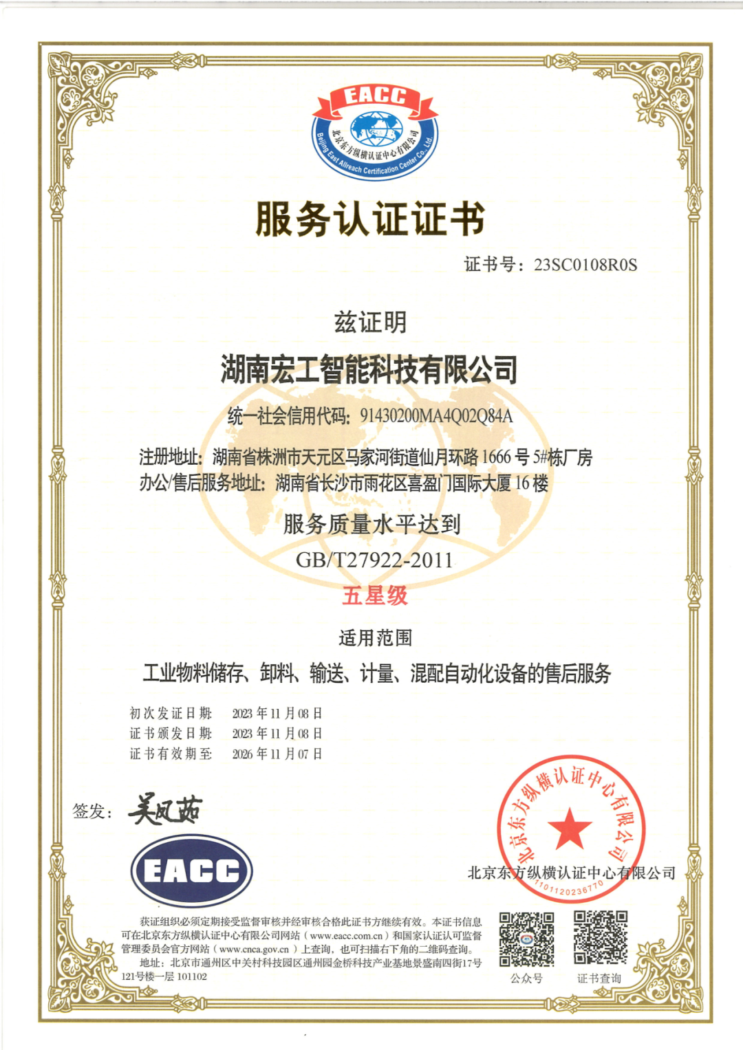 近日,宏工科技子公司湖南宏工智能科技有限公司售后服務(wù)通過質(zhì)量服務(wù)五星級(jí)認(rèn)證,標(biāo)志著宏工科技的服務(wù)能力與品質(zhì)得到行業(yè)和權(quán)威機(jī)構(gòu)的高度認(rèn)可。
