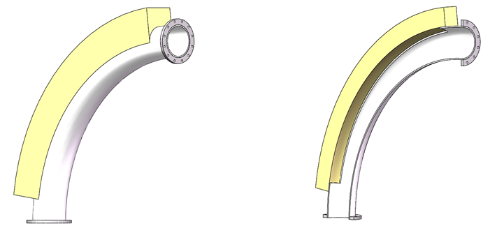 一般采用的背包式彎頭是由普通彎頭和扣接于彎頭外壁處的填充背包組成。物料在長期使用中將填充物磨掉,將有物料進入填充腔內,物料將會與物料進行摩擦,減少物料對彎頭處的磨損。使彎頭的使用周期大大增加,減少更換和修補耐磨彎頭的次數。