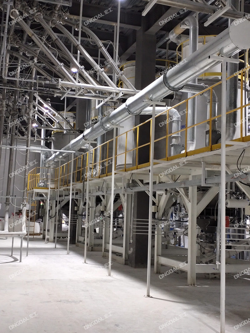 在物料預處理環節,創新采用噸包破包工作站,對1種重鈣與3種輕鈣原料進行集中拆包處理,配置專用除塵裝置實現無塵化作業。四類物料經封閉式管道分別輸送至獨立的大型儲料倉,通過倉體結構優化與流化裝置設計,有效避免粉體板結、架橋等問題,確保原料存儲穩定性。