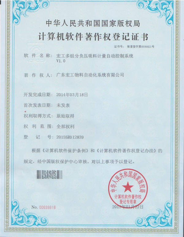 軟件著作權(quán)-宏工多組份負(fù)壓吸料計(jì)量自動(dòng)控制系統(tǒng)V1.0
