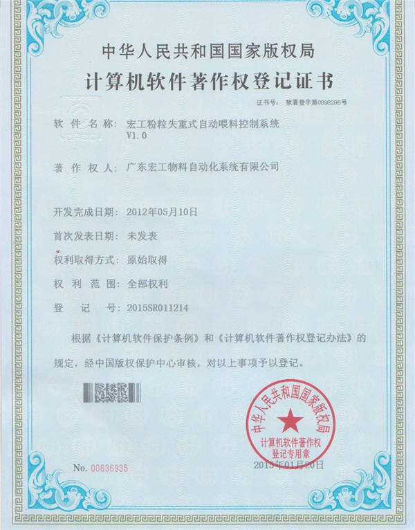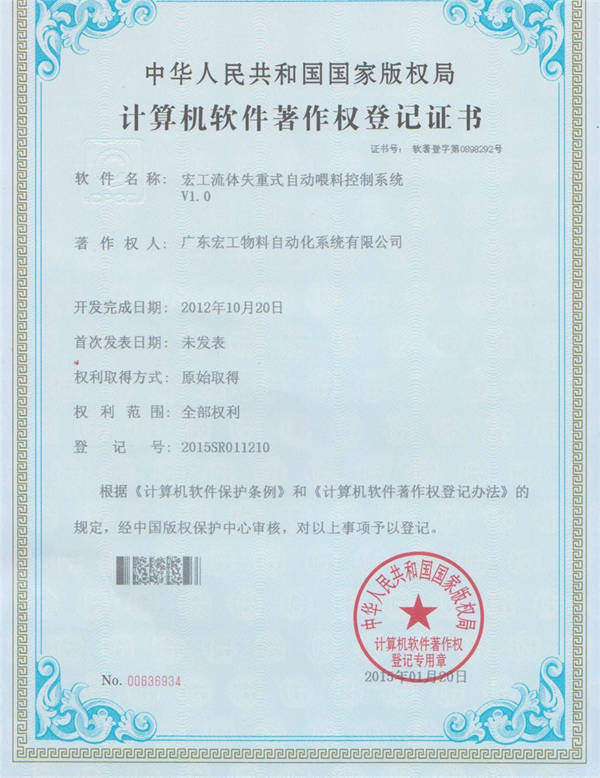軟件著作權(quán)-宏工粉粒失重式自動(dòng)喂料控制系統(tǒng)V1.0